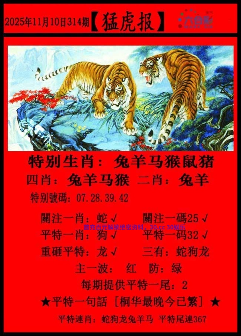 | 310期 | 鸡兔虎龙蛇鼠猴 | 开:虎16中 |